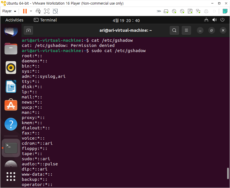→ /etc/shadow는 시스템의 중요한 보안 파일 중 하나로, 일반 사용자는 읽거나 쓸 수 없음