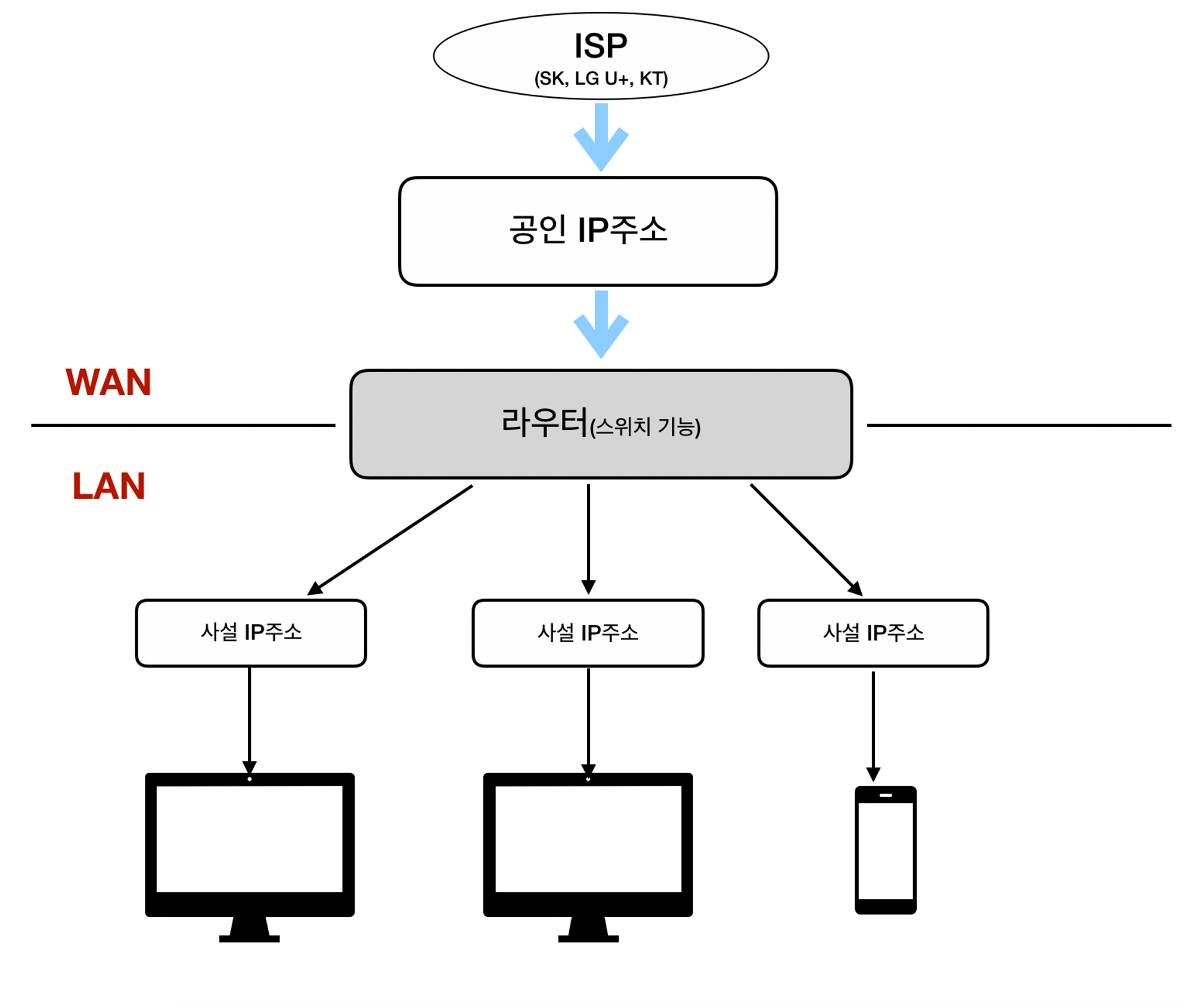 우리가 지금 사용하고 있는 IP주소는 대개는, 사설IP를 받아서 사용한다. 공인IP는 이미 고갈 상태이기 때문에 위에서 말한 라우터에만 IP를 할당한다.