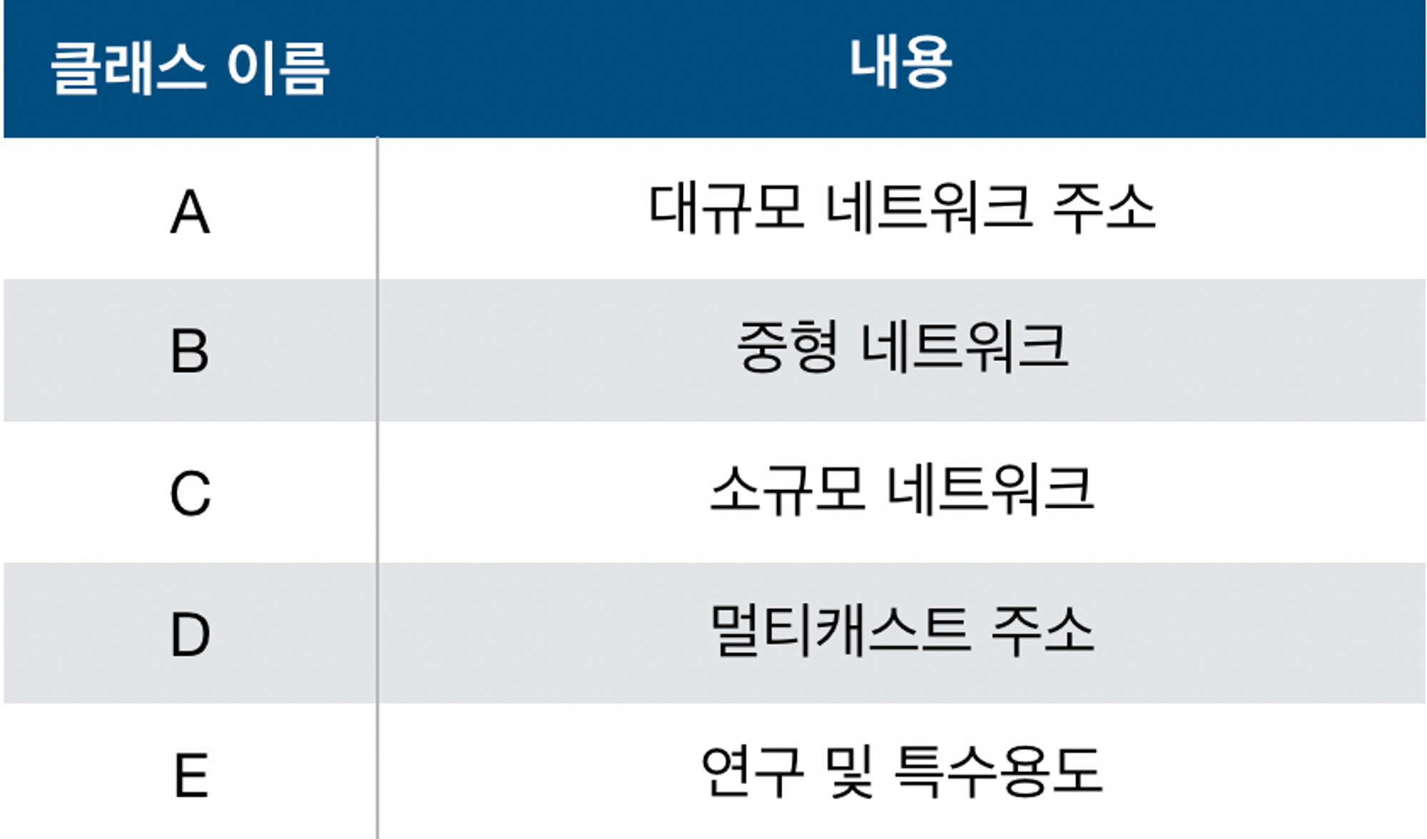 사설IP 할당 IPv4의 IP주소는 32비트이다. 또 이는 네트워크 ID와 호스트 ID로 나뉘어 있다. 네트워크ID란 ‘어떤 네트워크’인지를 나타내고 호스트 ID는 ‘해당 네트워크의 어느 컴퓨터’인지를 나타낸다. 클래스는 5개로 나뉘어져 있다. 목적에 따라서 5개 정도로 나뉘며 일반인들은 보통 A~C클래스를 사용할 수 있다.