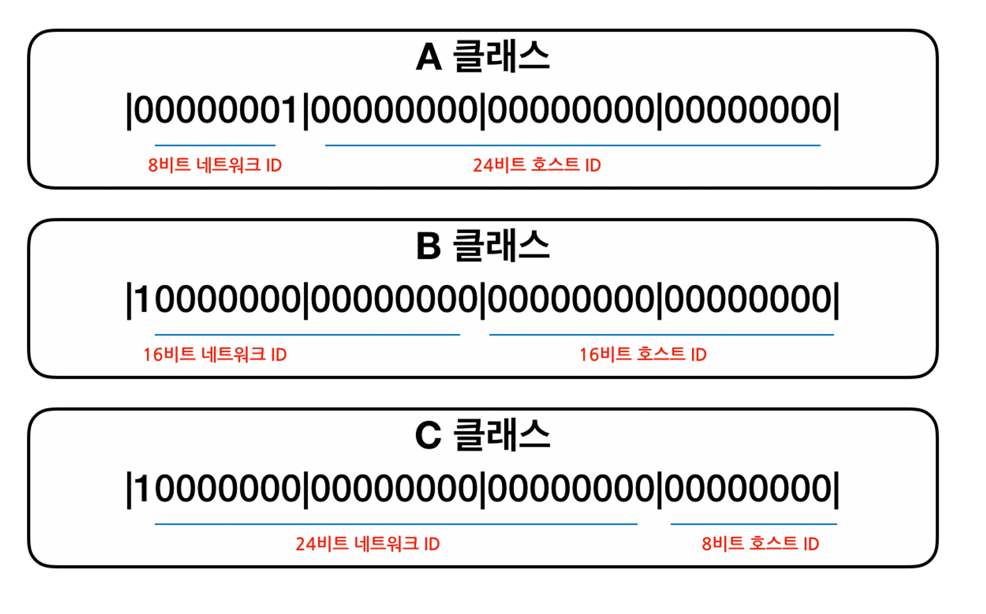 그리고 일반적인 A~C클래스를 기준으로 설명하면 각각 8, 16, 24비트로 네트워크와 호스트 ID가 나뉘어진다.