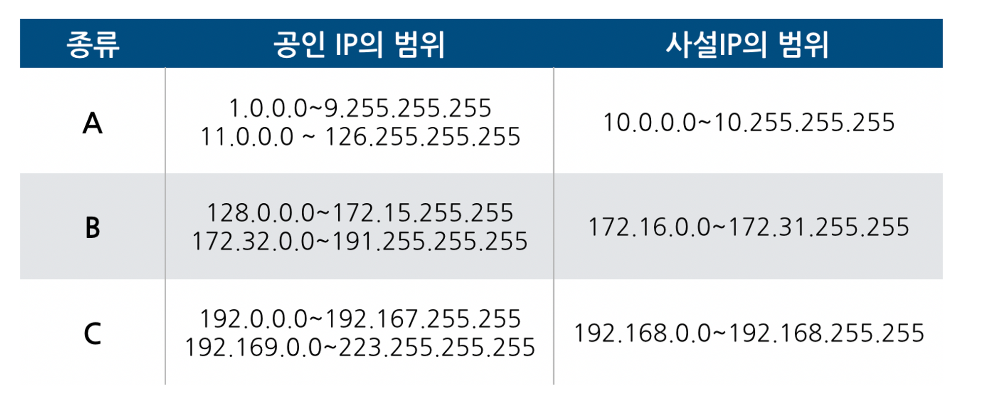 그리고 아래와 같이 공인 IP와 사설IP 주소를 정리해 보았다. 사설IP는 공인IP로 절대 사용할 수 없음을 알아두자.