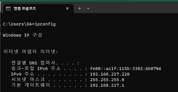 그리고 cmd창에 ipconfig라고 쳐도 나의 ip를 확인할 수 있다.