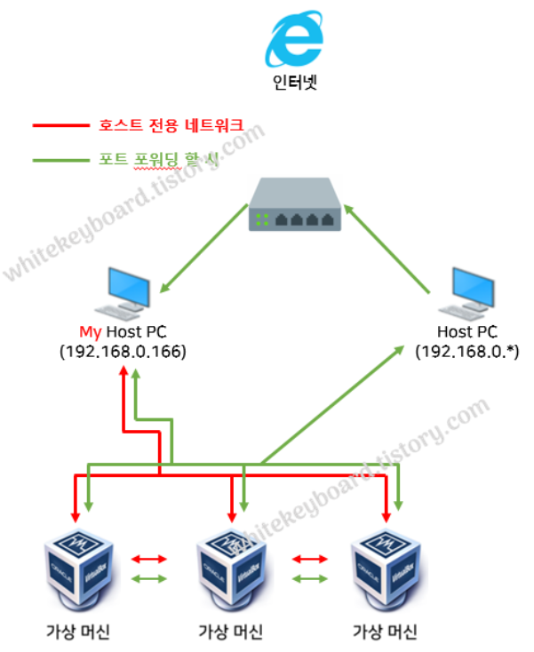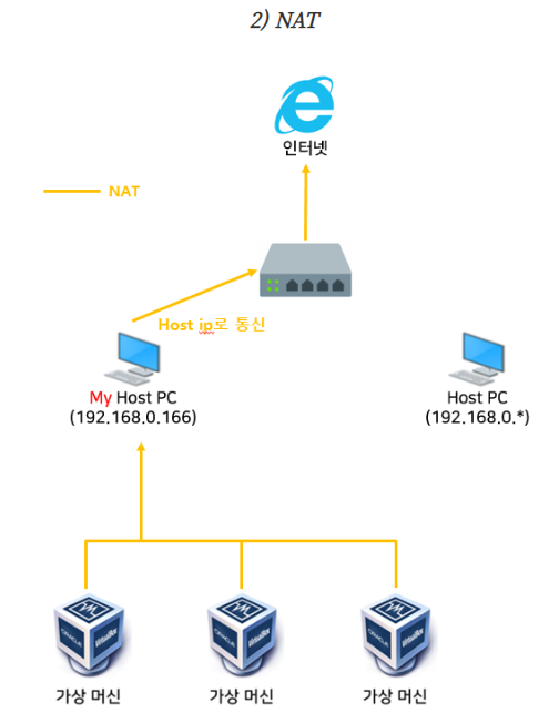 : 가상 머신에서 인터넷 접속이 가능한 형태인데, My Host PC의 ip를 빌려 인터넷에 접속하는 구조이다.